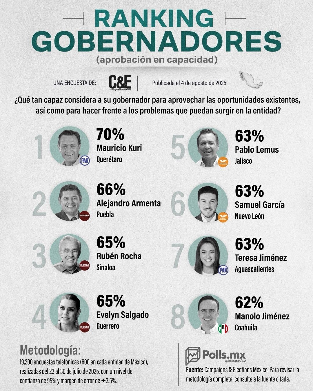 La casa encuestadora C&E Compaing & Electiones México ralizó un estudio durante el mes de julio de 2025 en el que preguntó a la ciudadanía sobre las capacidades de sus gobernadores para resolver los problmes de la entidad. De acuerdo a los resultados, el gobernador con la mejor evaluación fue el panista Mauricio Kuri, con 70 por ciento,